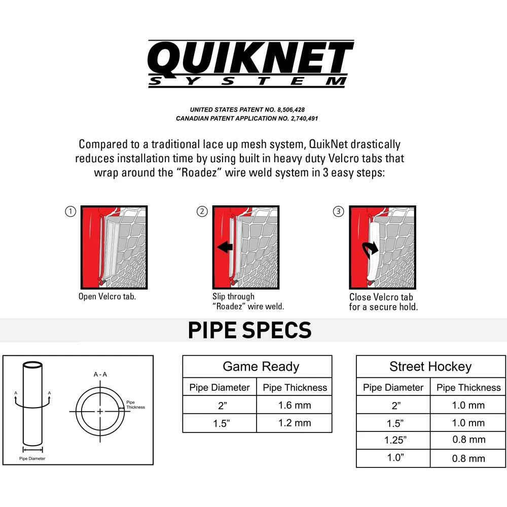 Compared to a traditional lace up mesh system, QuickNet drastically reduces installation time by using built in heavy duty velcro tabs that wrap around the “ROADEZ” wire wield system in 3 easy steps